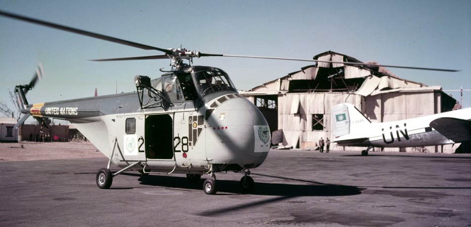 RCN Sikorsky HO4S-3, RCN (Coded 228), from HMCS Magnificent. The helicopter is painted in UN markings, and stands at Abu Suweir, near a hangar damaged during British raids. United Nations Emergency Force (UNEF) Egypt, 14 Jan 1957.