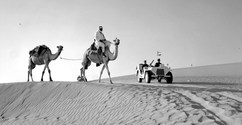 Scout cars contrast with camels during Canadian Reconnaissance Squadron Patrols of the Sinai desert, 11 Aug 1964.