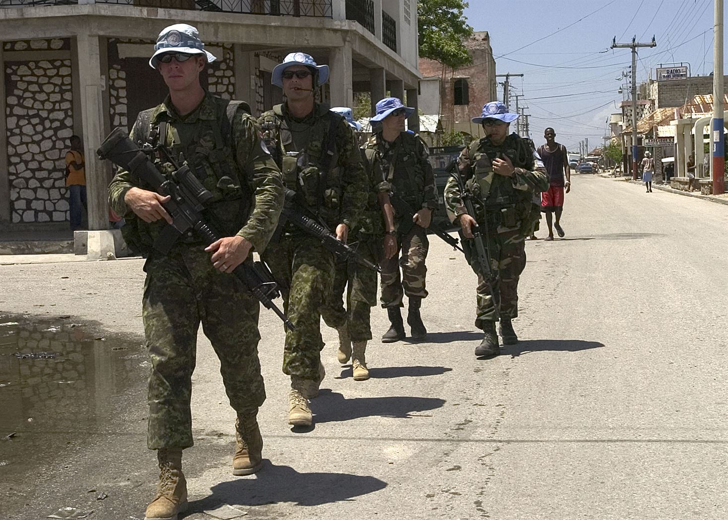 Canadian and Argentinian peacekeepers on foot patrol in Gonaives, Haiti.