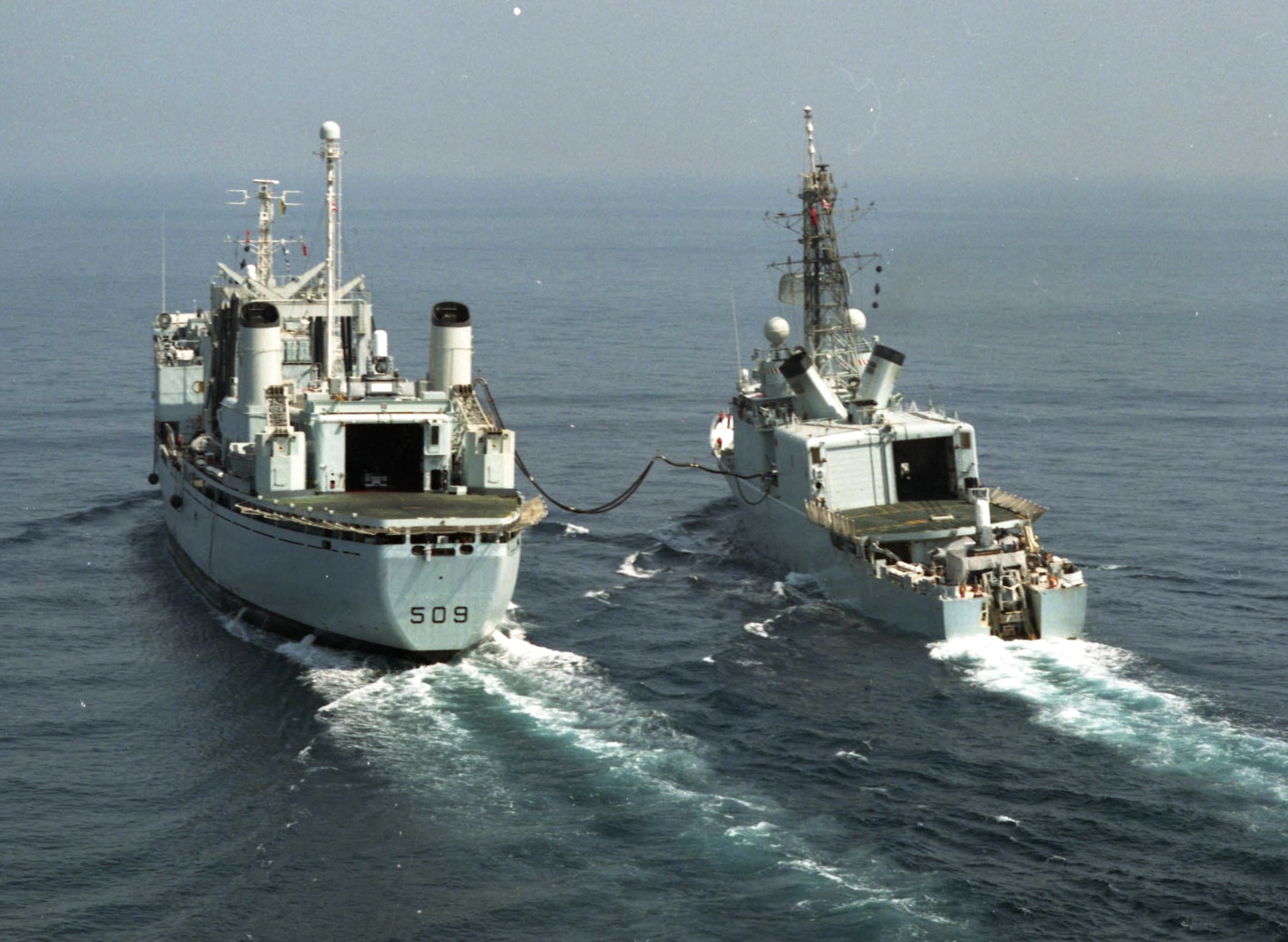 Canadian warships conducting replenishment at sea, Oct 1990.