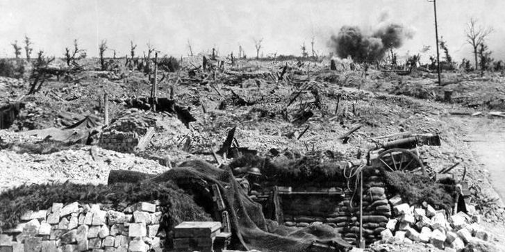 German shells bursting on Canadian positions at Lens, France in June 1917. In the foreground, a Canadian gun pit is camouflaged to avoid destructive enemy fire. (Canadian War Museum (George Metcalf Archival Collection) CWM 19920085-814)