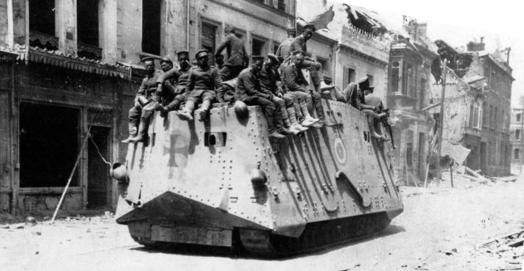 “An hour before dawn on 08 August 1918, British tanks lumbered forward through a heavy ground mist, the noise from their tracks a deafening sound” to the waiting soldiers, who were concerned that “an enemy bombardment would wreak havoc in the crowded assembly areas.” The British and Dominion guns however, suddenly crashed with one voice along the front. The surprise was complete. The German “front dissolved in panic and confusion, as tanks and infantry tore through their positions.” The attack swept inexorably forward, with “the main resistance encountered coming from pockets of infantry or machine-gun posts which often capitulated when outflanked. For the first time in the war, massed cavalry, accompanied by light “whippet” tanks, came forward to exploit success. On the 4th Divisions front however, thickly emplaced machine-guns swept the flat fields and the Canadian infantry were forced to dig in short of their objective. Elsewhere, the day’s objectives had all been reached and a firm grip obtained on the Amiens Outer Defence Line across the entire Corps front.”[43]