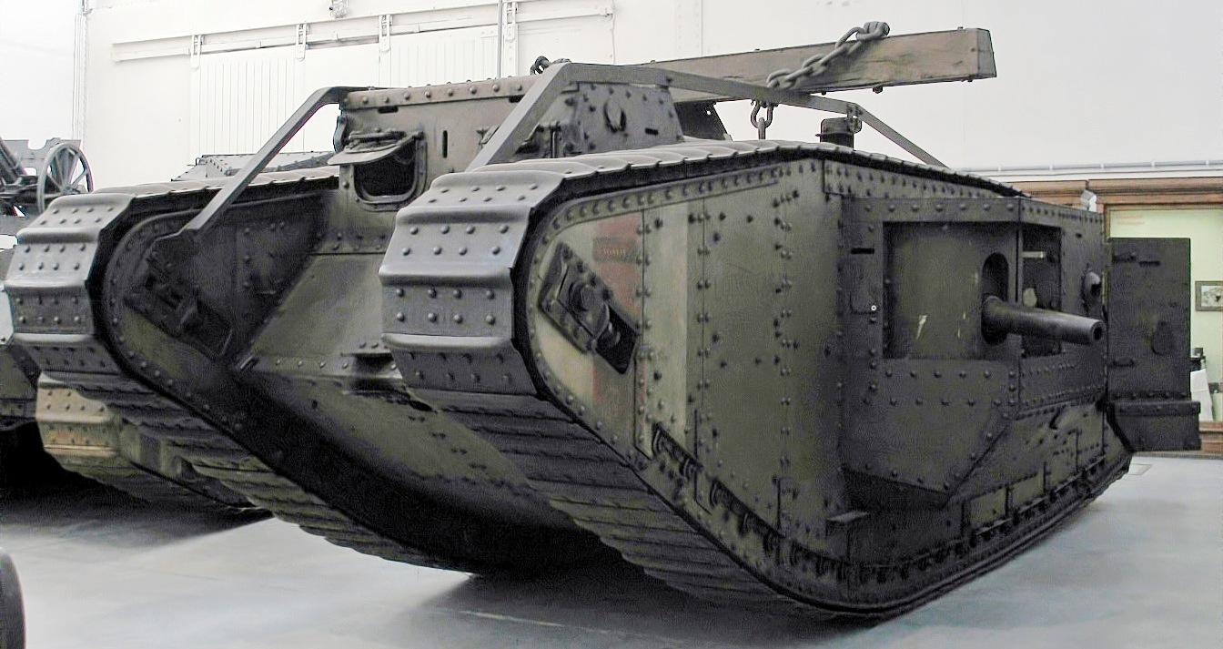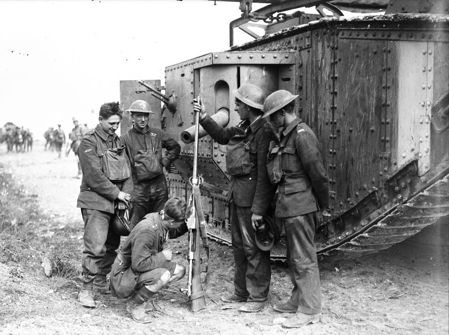 Canadian soldiers examining a German anti-tank Rifle beside a British tank, Battle of Amiens, Aug 1918.