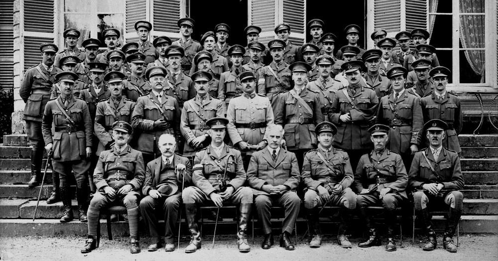 General Currie (3rd from left), with with Canada’s Prime Minister Sir Robert Borden (4th from left) and Officers in France, July 1918.