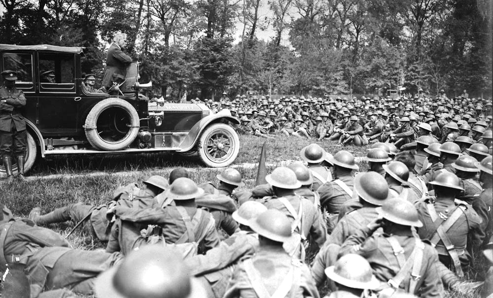 Sir Robert Borden speaking to Canadian troops in France in July 1918.