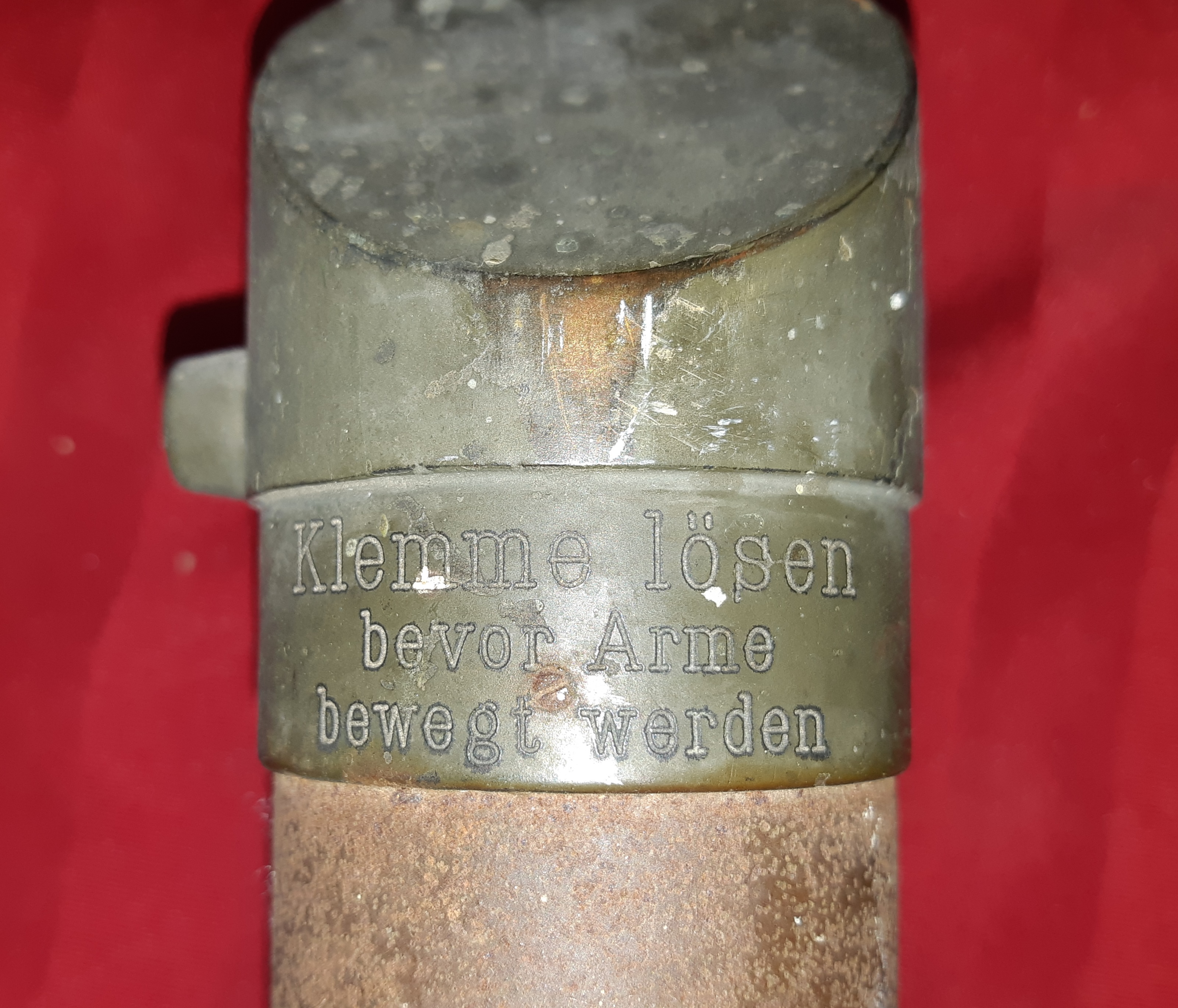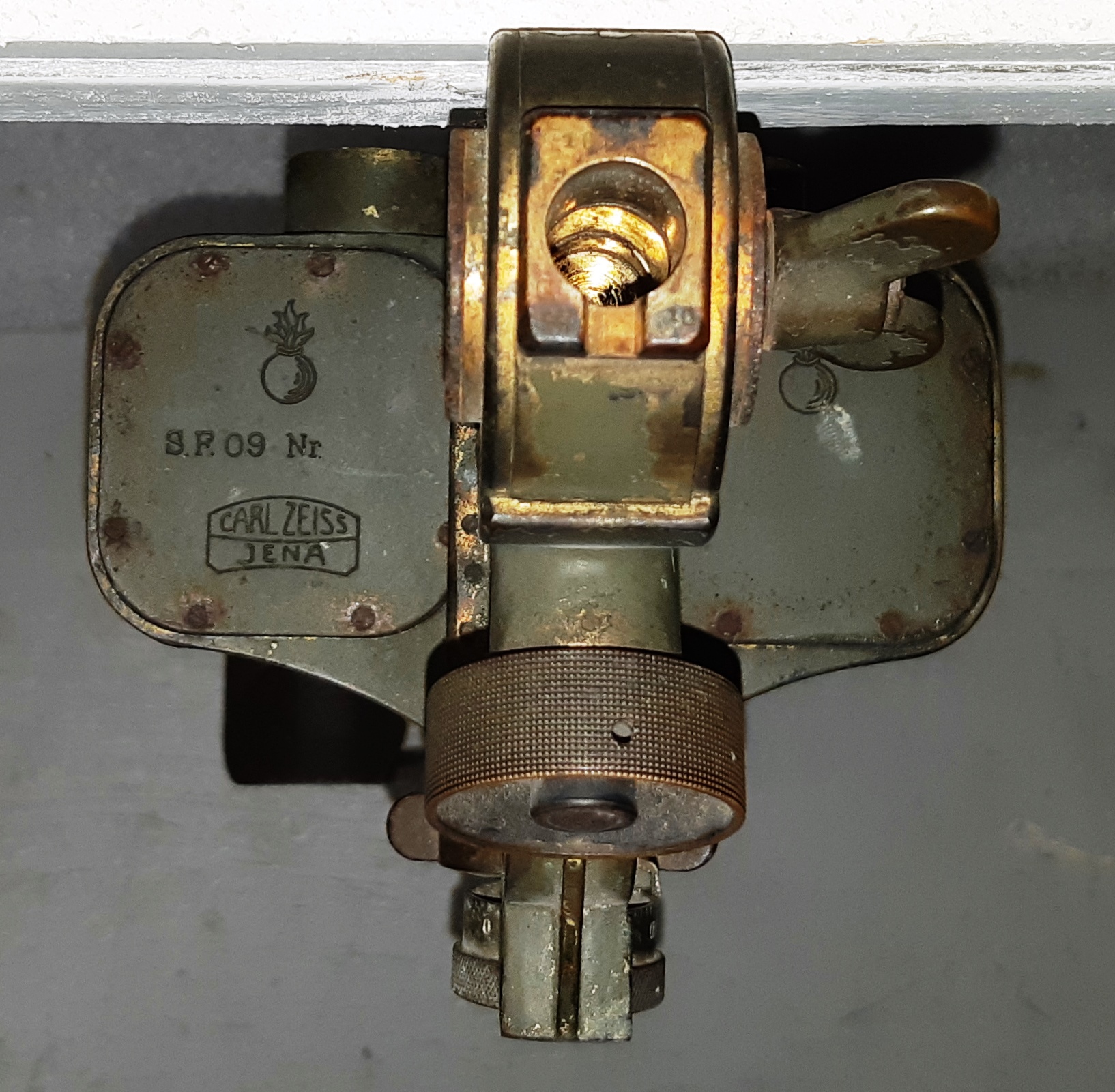 The museum’s optical periscope (Scherenfernrohr) [scissors telescope], was manufactured by Carl Zeiss, Jena, Germany. These ranging binoculars were used in the trenches for artillery spotting. The periscope has a “CarlZeiss Jena” maker’s mark. “NF Klemme losen bevor Arme bewegtwerden” (Translated as to “loosen terminal before arms are moved”) on back side of lens housing. “S.F.09” is stamped on base of the lens housing, with with two grenade symbols. The device consists of a pair of adjustable optical periscopes, missing the mounting tripod.