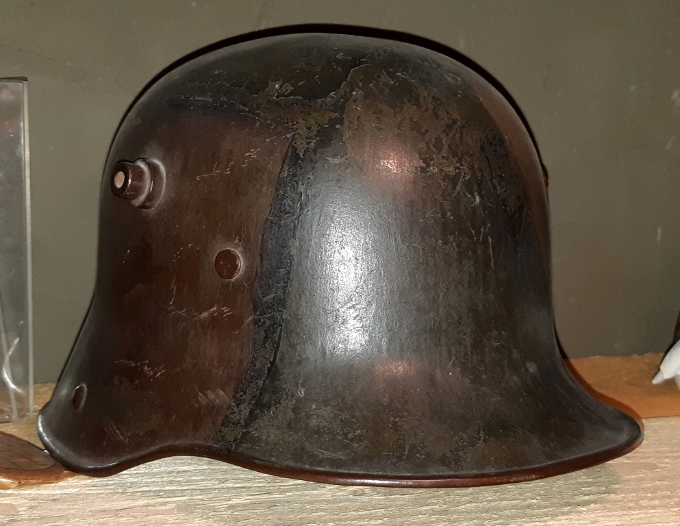 The armies of major European powers introduced helmets of this type during World War I. The German Army began to replace the traditional boiled leather Pickelhaube (‘spiked helmet’) with the Stahlhelm in 1916. The Stahlhelm, with its distinctive “coal scuttle” shape, was instantly recognizable and became a common element of propaganda on both sides, just like the Pickelhaube before it.