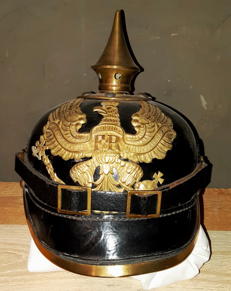 German Prussian Pickelhaube Brass and Leather Spiked First World War Officer’s Dress Helmet.