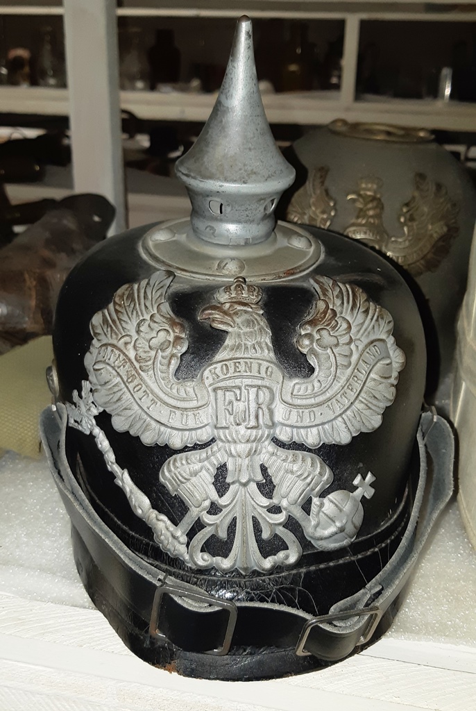 German First World War Pickelhaube (pl. Pickelhauben; from German: Pickel, lit. ‘point’ or ‘pickaxe’, and Haube, lit. ‘bonnet’, a general word for “headgear”), also Pickelhelm. This is a spiked helmet that was worn in the 19th and 20th centuries by Prussian and German military officers, firefighters and police. Although it is typically associated with the Prussian Army, which adopted it in 1842–43, the helmet was widely imitated by other armies during that period. It is still worn today as part of ceremonial wear in the militaries of certain countries, such as Sweden, Chile, and Colombia.