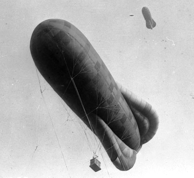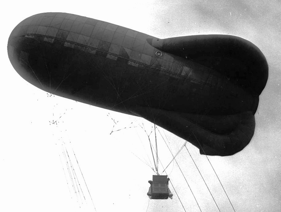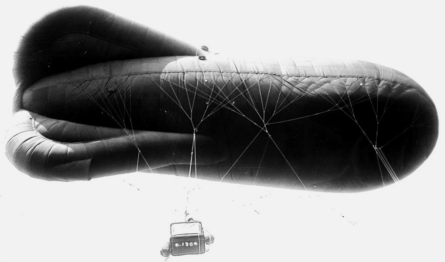 These balloons were primarily employed as an aerial platform for intelligence gathering and artillery spotting. The First World War kite balloons were fabric envelopes filled with hydrogen gas. Unfortunately, the flammability of the gas led to the destruction of hundreds of balloons on both sides. Observers manning these observation balloons frequently had to use a parachute to escape when their balloons were attacked. To avoid the potentially flammable consequences of hydrogen, observation balloons after the First World War were often filled with non-flammable helium. As will be seen in the following photos, balloons were usually tethered to a steel cable attached to a winch that reeled the gasbag to its desired height (usually 1,000-1,500 metres) and retrieved it at the end of an observation session.