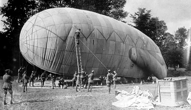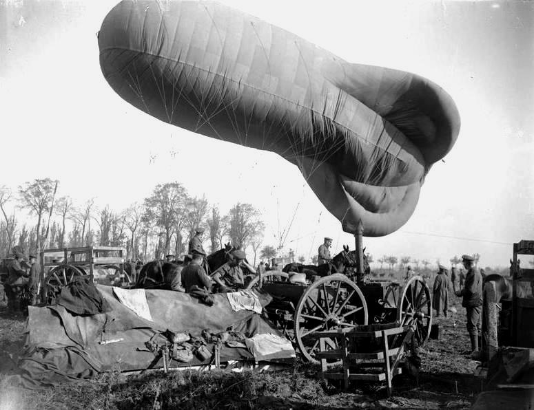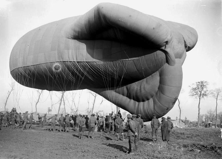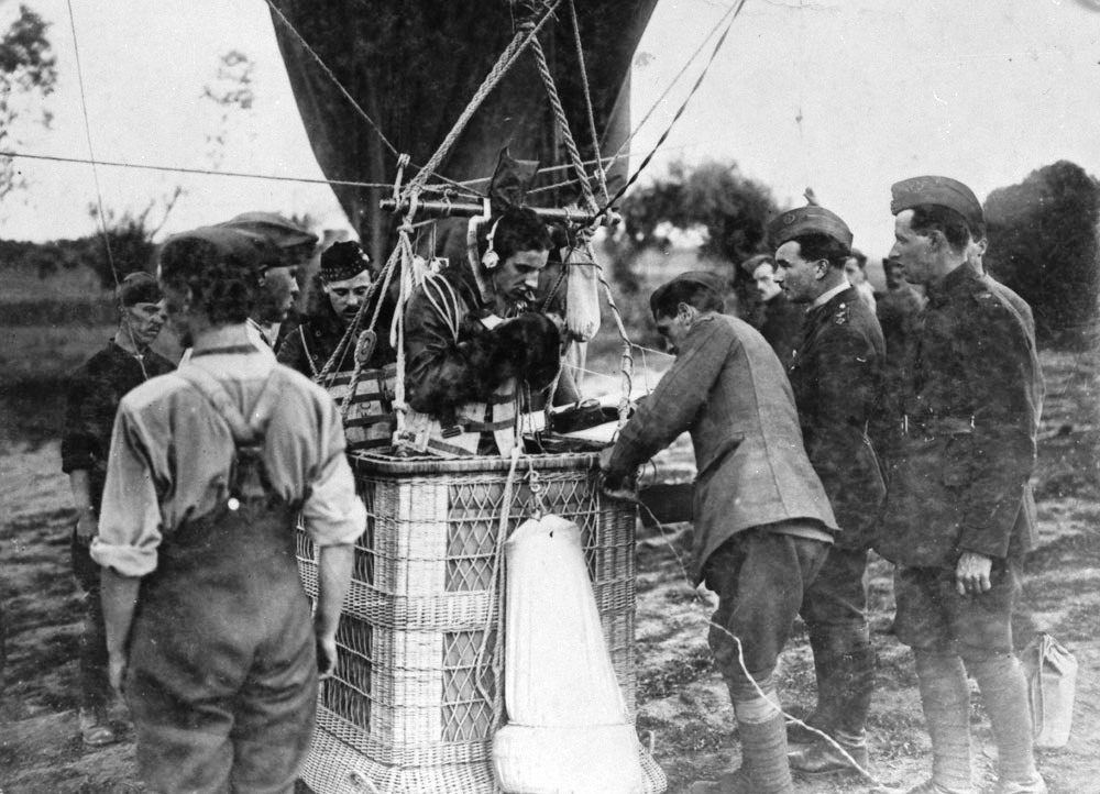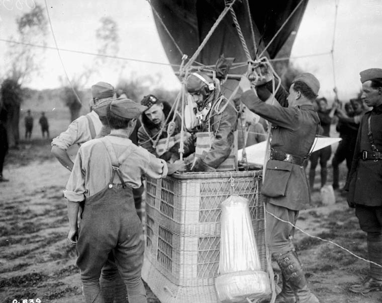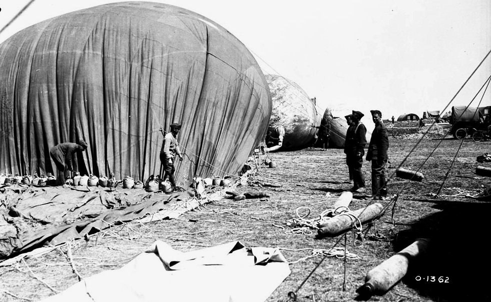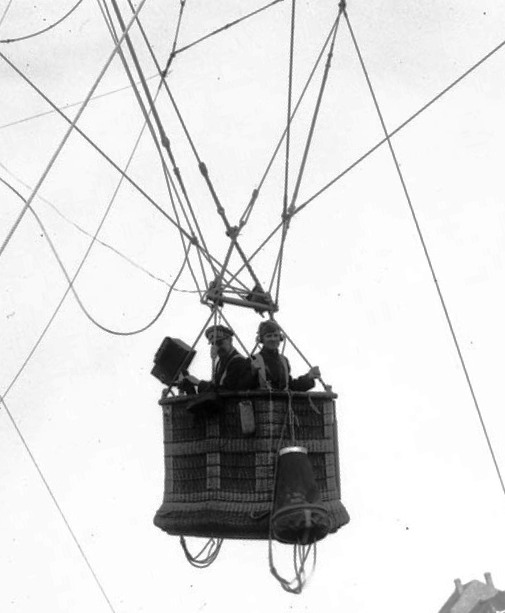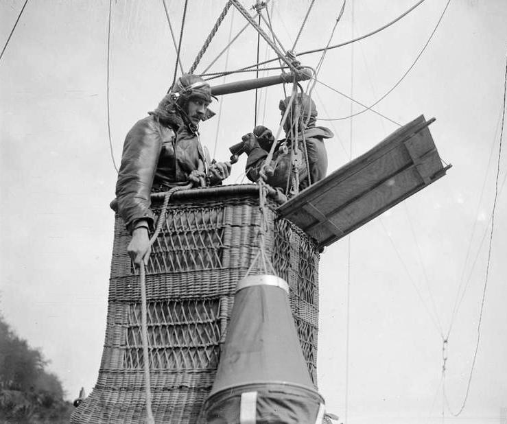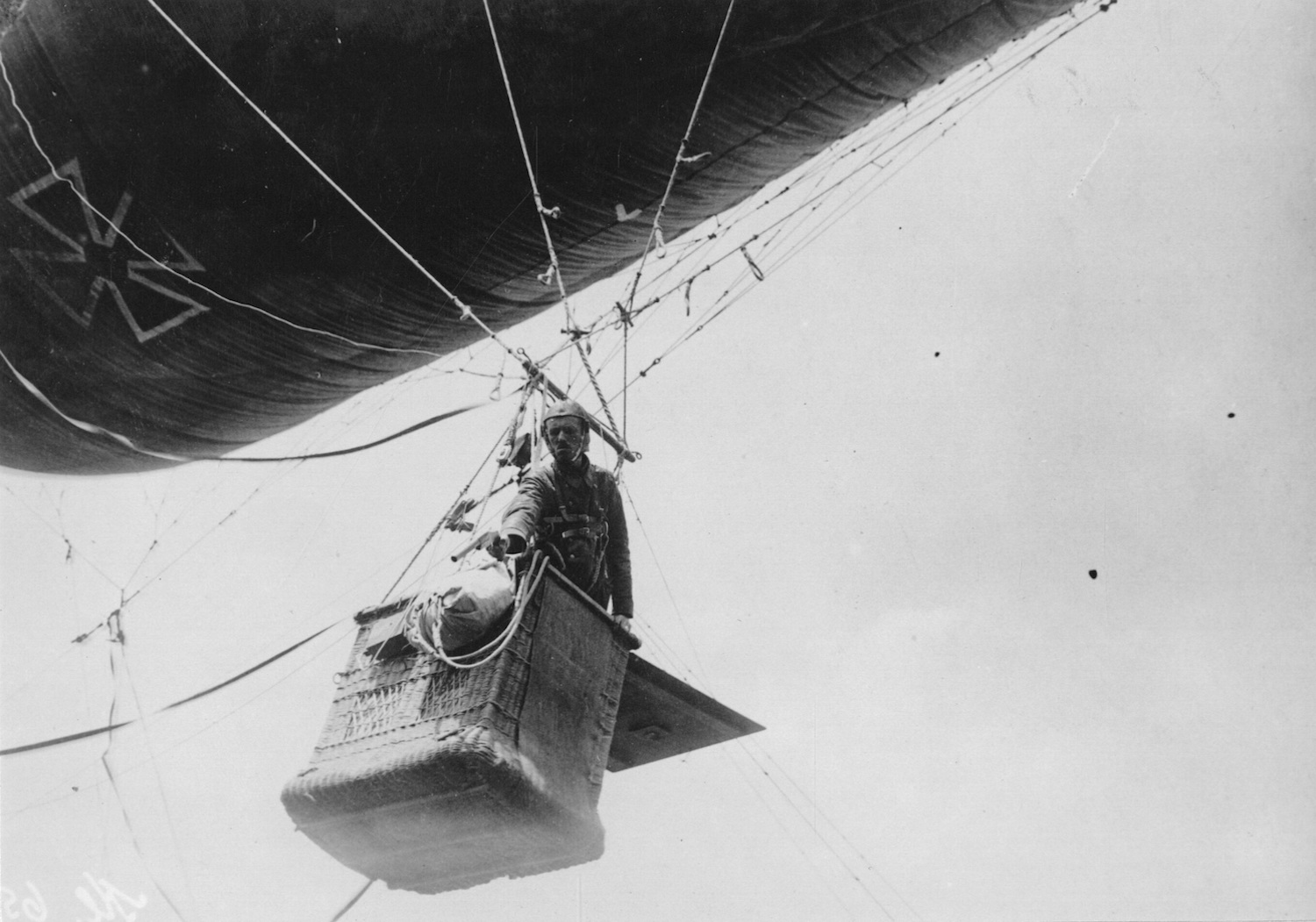 A German observation balloon fitted with a long distance camera about to ascend with one observer in the basket. The observer’s escape parachute can be seen attached to the outside of the basket.
