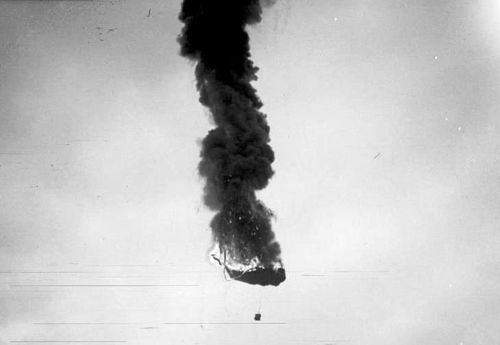 A British Caquot kite balloon falling down in flames after having been attacked by an enemy aircraft. Boyelles, France, 3 February 1918.