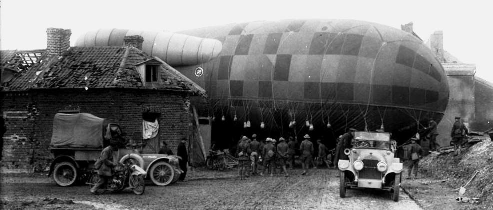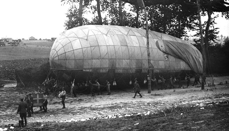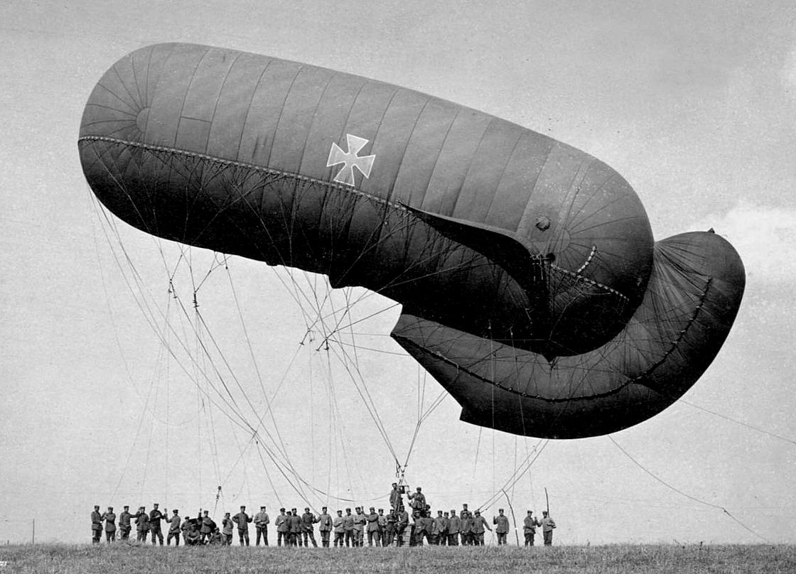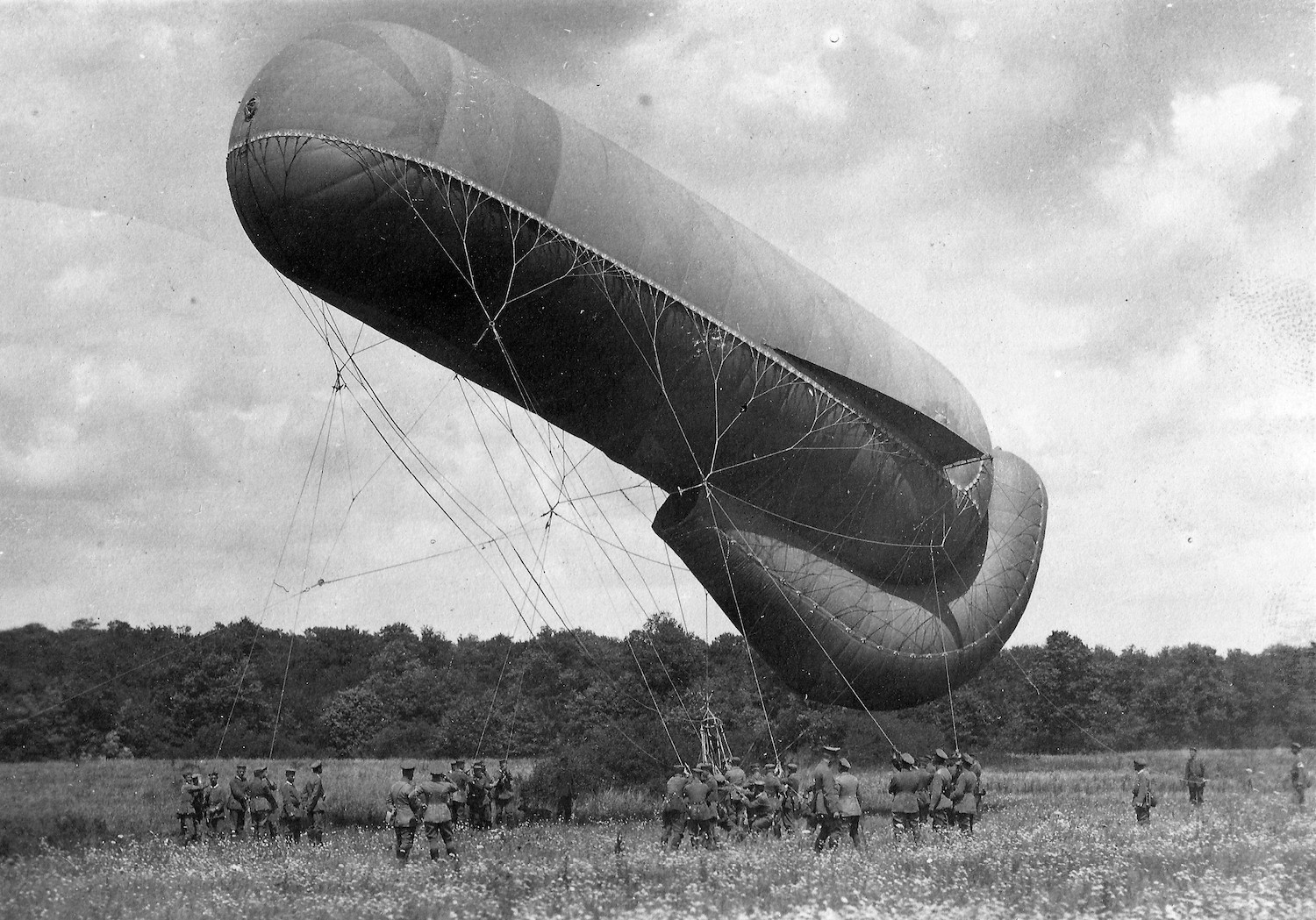 German Parseval-Siegsfeld type balloon at Équancourt, France, in September 1916. The rear “tail” fills with air automatically through an opening facing the wind.