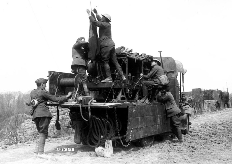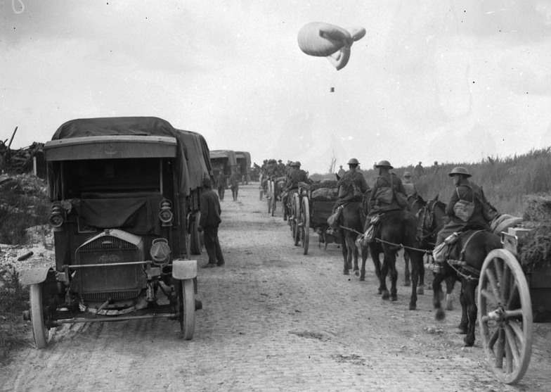 Kite balloon being lowered as Canadian Artillery moves by, East of Arras, Sep 1918.