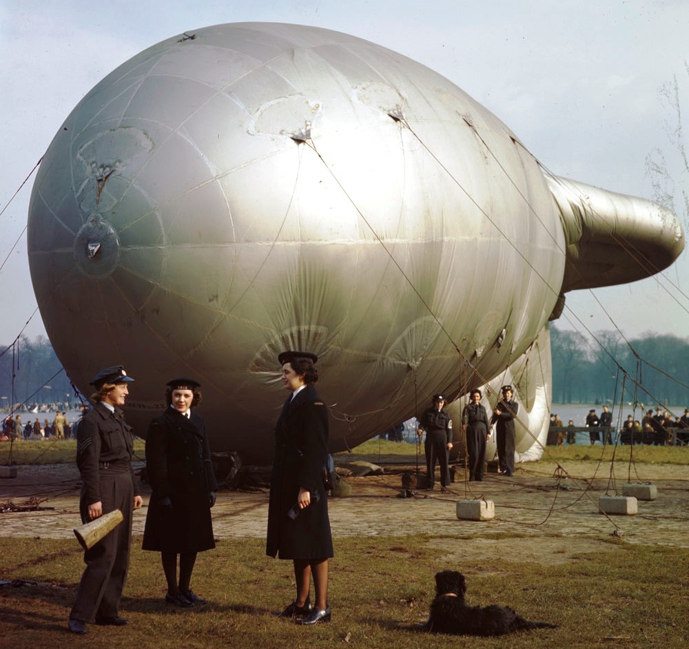 Members of the Women’s Royal Canadian naval Service (WRCNS) visiting a barrage balloon site with The Women’s Auxiliary Air Force (WAAF) operating the balloons inthe UK, 1944.