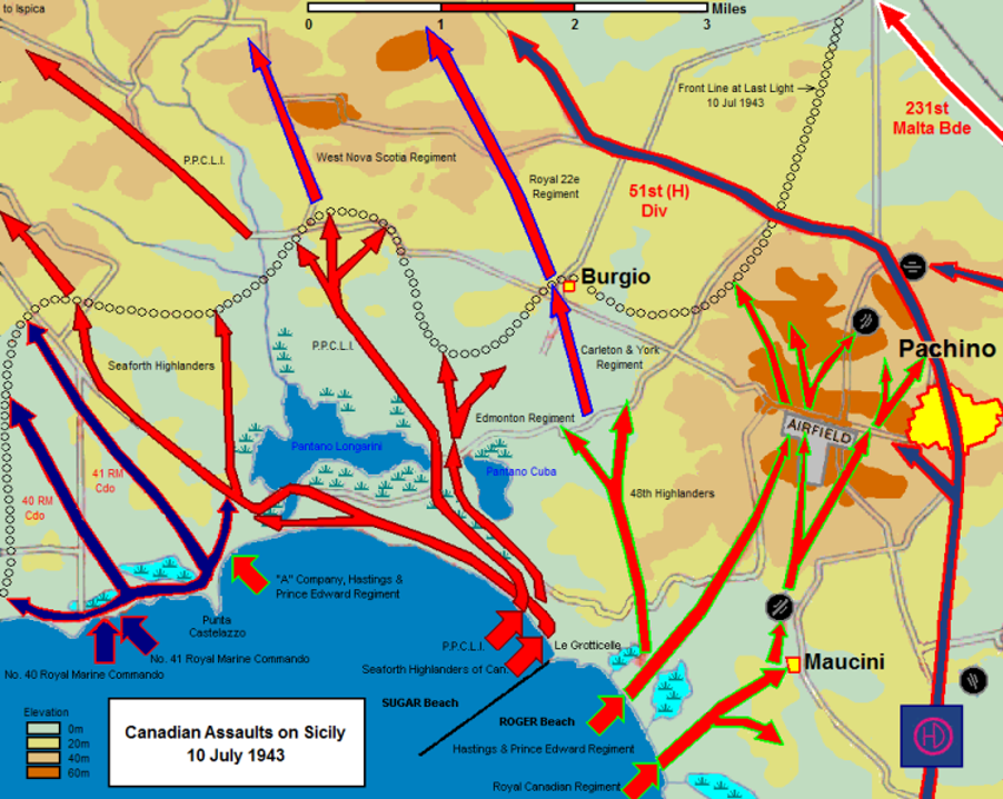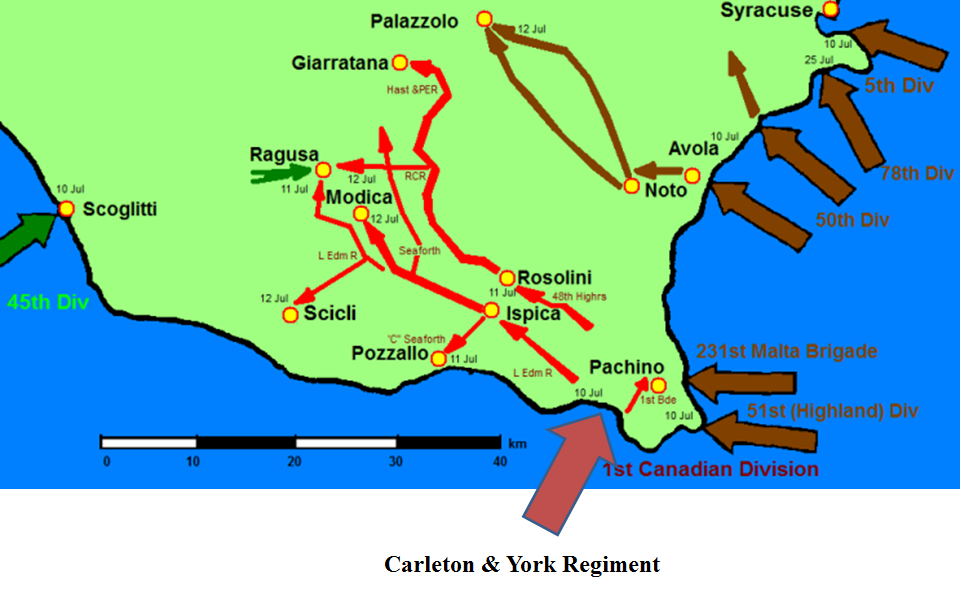 Map. On 10 July 1943, the Carleton & York Regiment landed at Pachino in the opening waves of the Allied Invasion of Sicily. Operation Husky, began with a large amphibious and airborne operation, followed by a six-week land campaign.