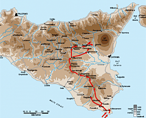 Map. Route Canadians followed in Operation Husky.