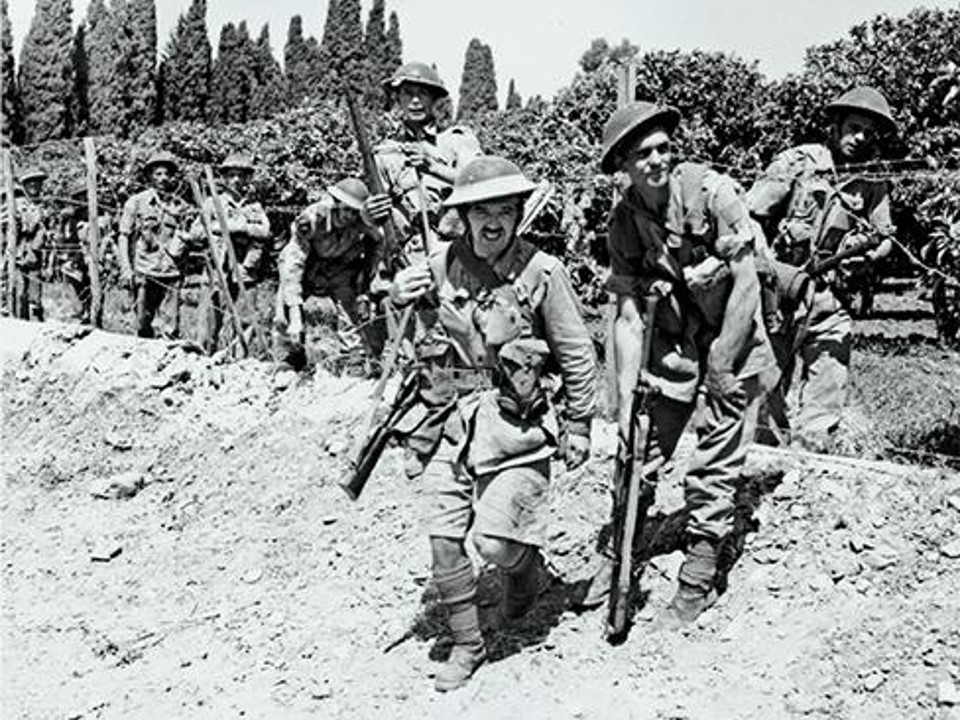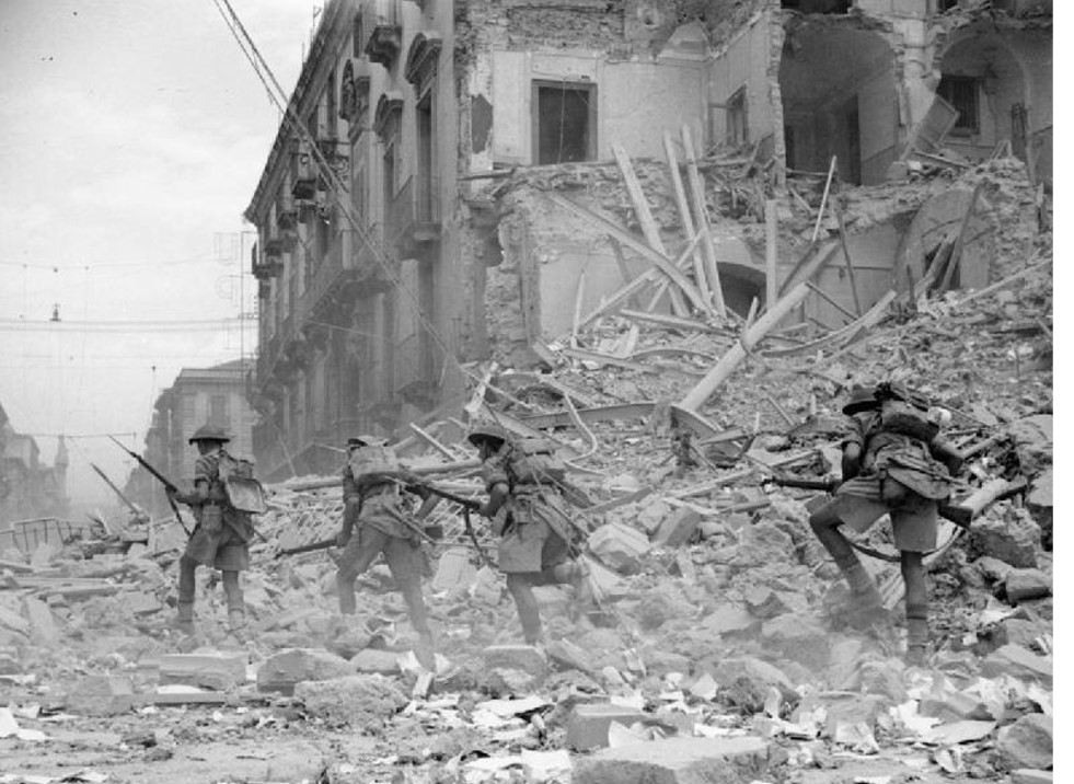 British troops scramble over rubble in a devastated street in Catania, Sicily, 5 August 1943.