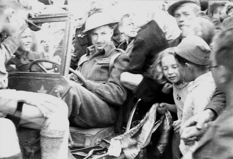 Carleton & York Regiment soldier in a jeep is crowded by newly liberated Dutch civilians, Leidschendam, Netherlands, 7 May 1945.