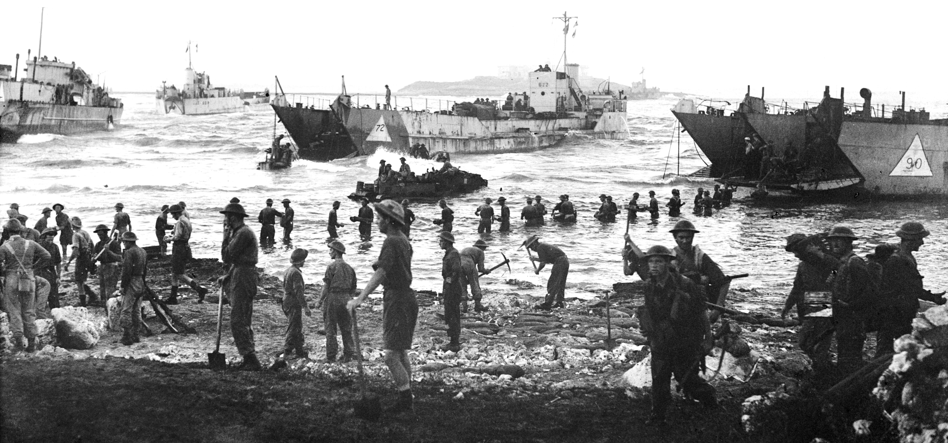 Just after dawn, men of the Highland Division up to their waists in water unloading stores on a landing beach on the opening day of the invasion of Sicily. Meanwhile beach roads are being prepared for heavy and light traffic. Several landing craft tank can be seen just of the beach (including LCT 622).