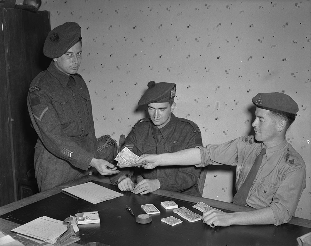Canadian Army soldiers in Germany receiving their pay in German marks, 9 July 1945.