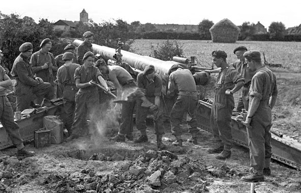 Gunners of “X” Battery, Royal Canadian Artillery (RCA), digging a breech pit for a captured 155-mm gun to be used to fire on Dunkirk. Adinkerke, Belgium, 15 September 1944.