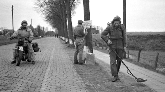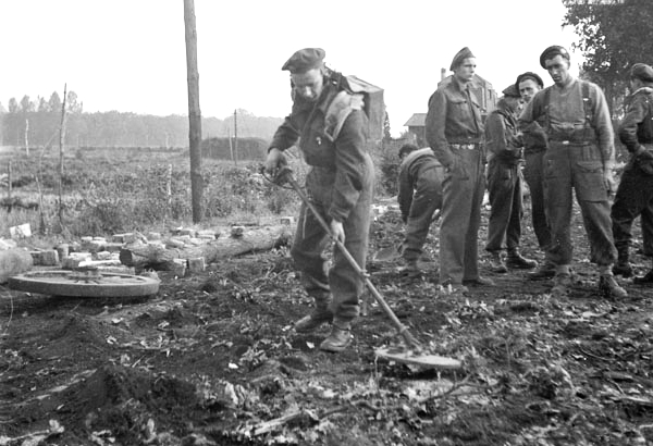 Sapper W.H. Lindstrom, 2nd Field Company, Royal Canadian Engineers (RCE), sweeping for mines at a roadblock, Kappellen, Belgium, 5 October 1944.