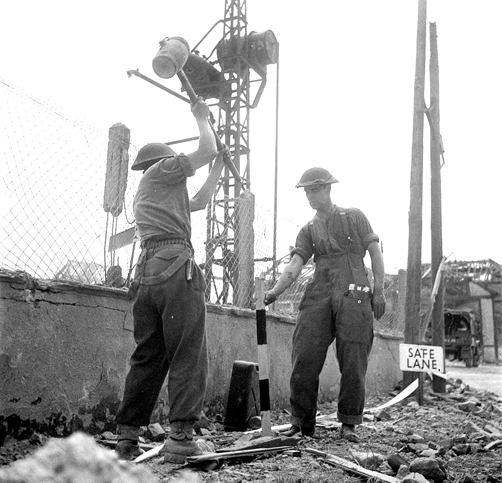 Sapper J.B. Sweeney and Lance-Corporal C.K. Halmsley of the Royal Canadian Engineers (RCE) pounding in safety stakes along a road in Vaucelles, France, 23 July 1944.