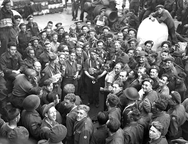 Lieutenant Leslie Herbert Browne, Royal Canadian Engineers, playing his David Glen bagpipes aboard a ship en route to France on D-Day, 6 June 1944.