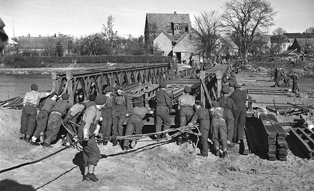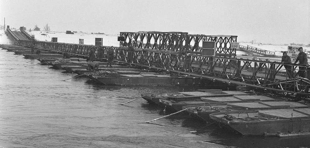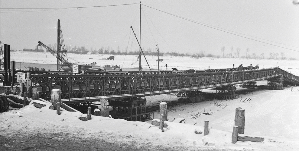 View of the sliding bay of the ‘Yardley’ bailey bridge installed by the Royal Canadian Engineers (RCE) over River Maas. Ravenstein, Netherlands, 1 Feb. 1945.