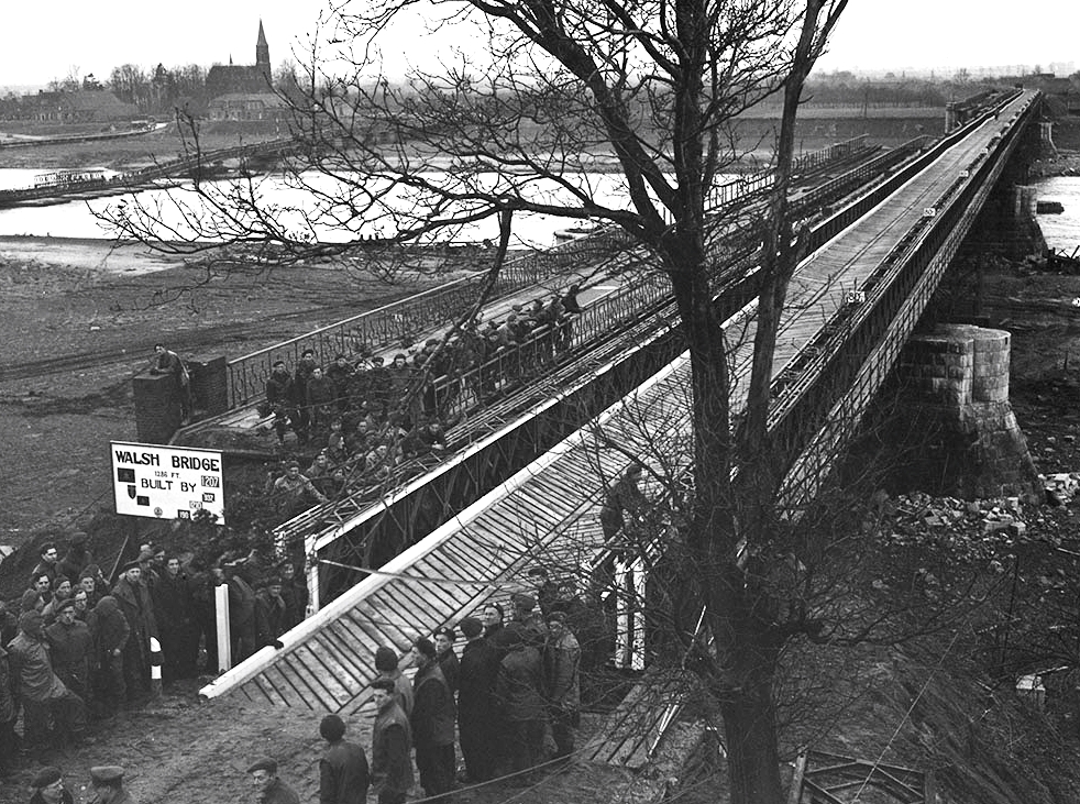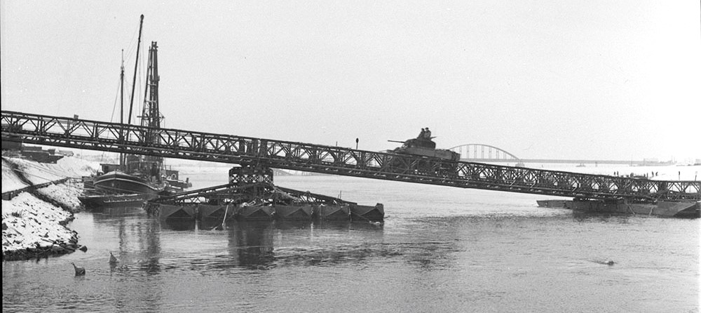 Looks like an M3 Stuart light tank crossing the double landing bay of the ‘Quebec’ bailey bridge installed by the Royal Canadian Engineers (RCE) over the River Maas. Ravenstein, Netherlands, 1 February 1945.