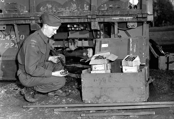 A Royal Canadian Engineers (RCE) sapper examining “Jackbits” detachable drills, England, ca. 1944.