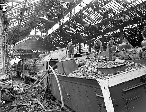 Personnel of No. 1 Railway Workshop Company, Royal Canadian Engineers (RCE), preparing to repair damaged locomotives, Vaucelles, France, 23 July 1944.