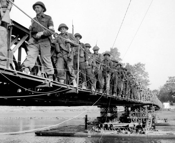 Lieutenant-Colonel Charles Petch, Commanding Officer, leading The North Nova Scotia Highlanders across London Bridge, an RCE Bailey bridge built across the Odon River south of Caen, France, 18 July 1944.