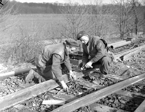 Sappers of the 16th Field Company, Royal Canadian Engineers (RCE), removing a damaged rail from the Paris-Cherbourg railway line near Carpiquet, France, 8 July 1944.