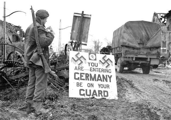 Corporal Urban Mayo of the 13th Field Company, Royal Canadian Engineers (RCE), reading a sign which states, “You are entering Germany – Be on your guard”, Wyler, Germany, 9 February 1945.