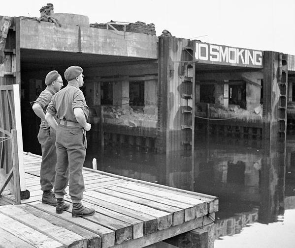 Sergeant Pat Wood and Lieutenant L.F. Labow of the 2nd Drilling Company, Royal Canadian Engineers (R.C.E.), preparing the demolition of former German E-Boat pens, Ostend, Belgium, 21 May 1945.