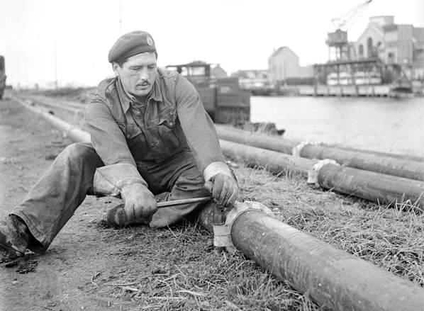 Sapper J.D. Martel, 3rd Battalion, Royal Canadian Engineers (RCE), tightening couplers during construction of the Ostend-Ghent oil pipeline, Ostend, Belgium, 18 October 1944.