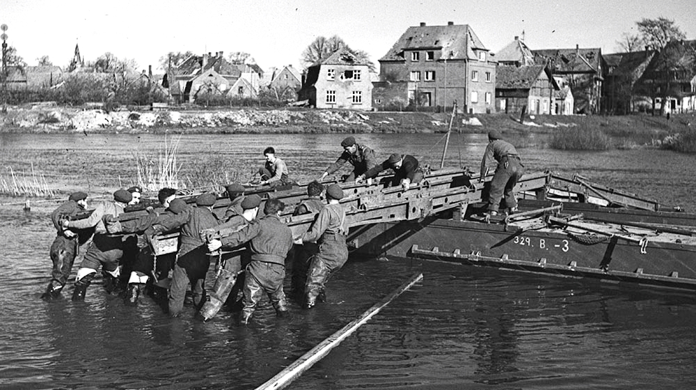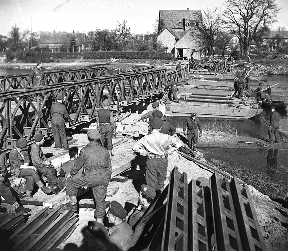 Personnel of the Royal Canadian Engineers building a pontoon bridge across the Dortmund-Ems Canal, 8 April 1945.