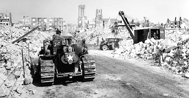 RCE bulldozer clearing rubble from the streets near the ruins of a church in Normandy, 16-17 August 1944.