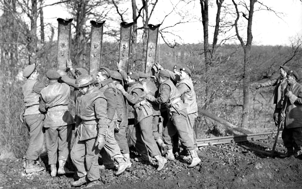 Personnel of the 9th Field Squadron, Royal Canadian Engineers (RCE), lifting rails to make a road for Canadian vehicles near the Hochwald, Germany, 2 March 1945.
