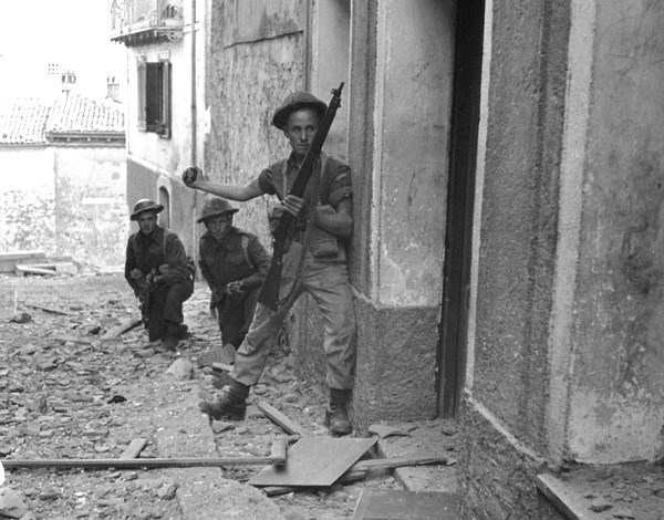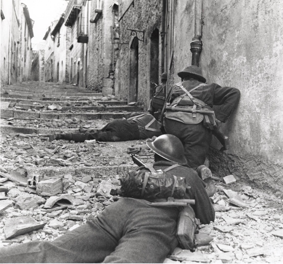 Under sniper fire, personnel of the Carleton and York Regiment advance up the steep main street of the mountain village of Campochiaro, Italy, 21 October 1943.  (Library and Archives Canada Photo)