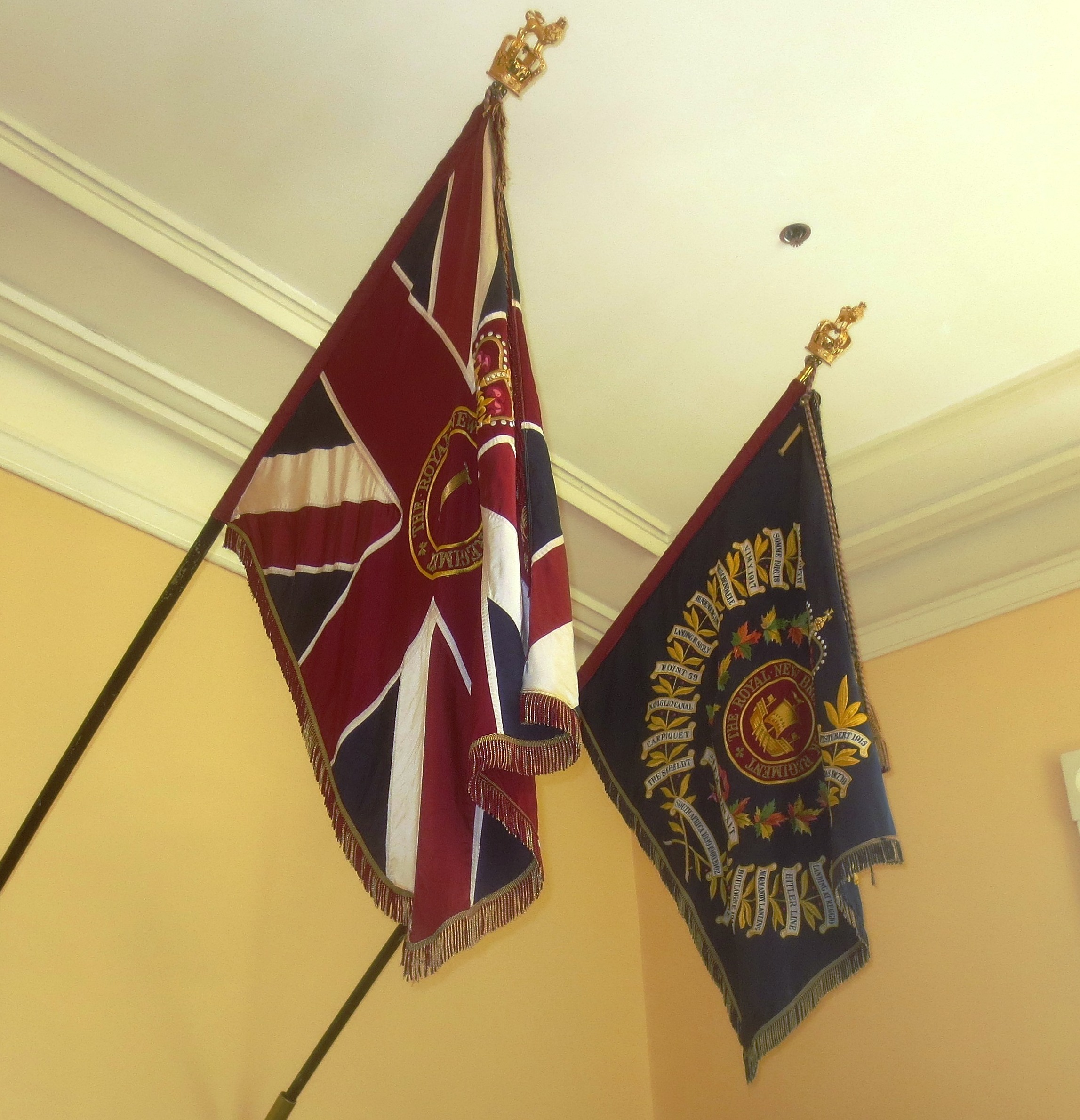 On 10 February 1955 the Queen’s and Regimental Colours of the Carleton and York Regiment were laid up in the Legislative Assembly, where they are on view to the public.  The Colours on display were the gift of the Honorable Murray MacLaren, Honourary Colonel of the Regiment and Lieutenant-Governor of New Brunswick, with the Regimental Colour emblazoned with their battle honours from the First World War and the South African War.  These colours were presented to the Regiment by His Majesty King George VI at Caterham, Surrey, England on 1 July 1941.