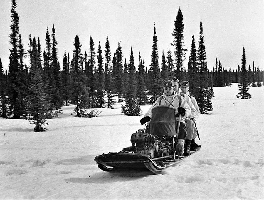 New Brunswick Rangers patrolling on a motorized toboggan, May 1943.