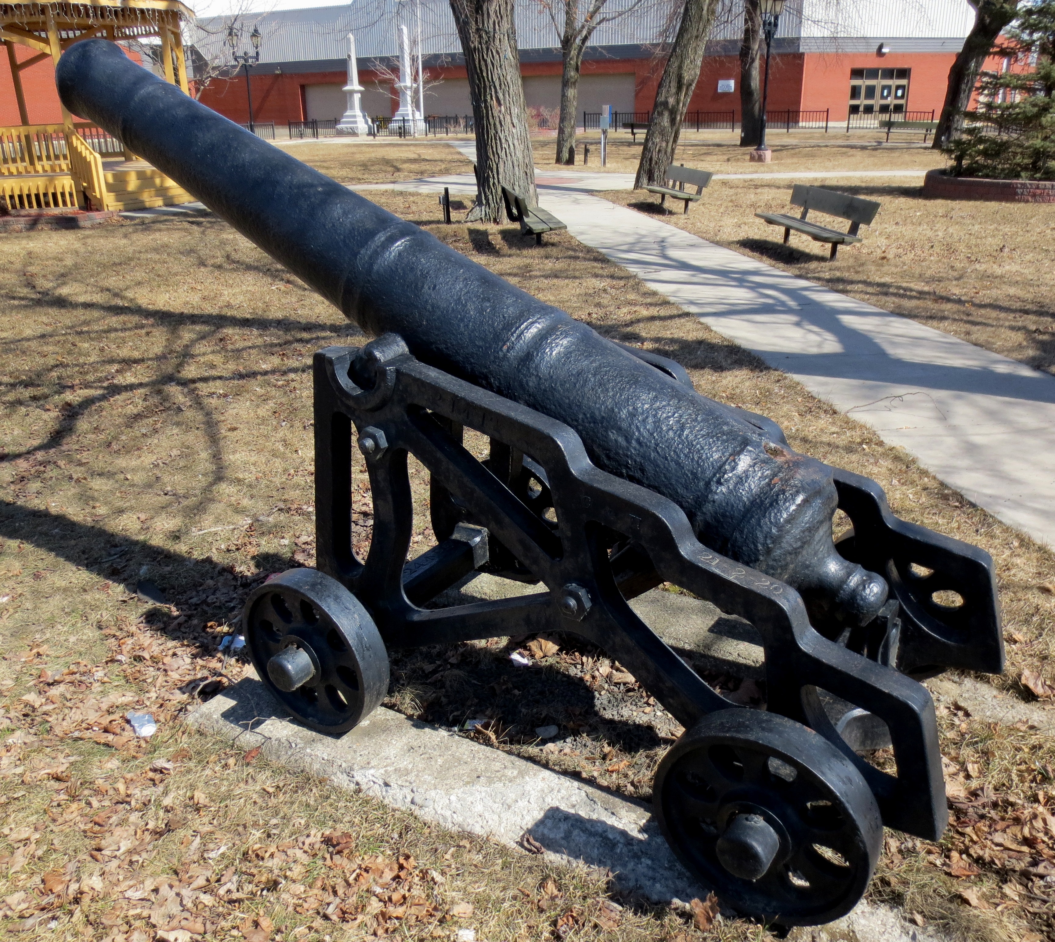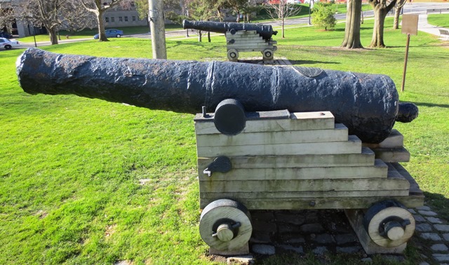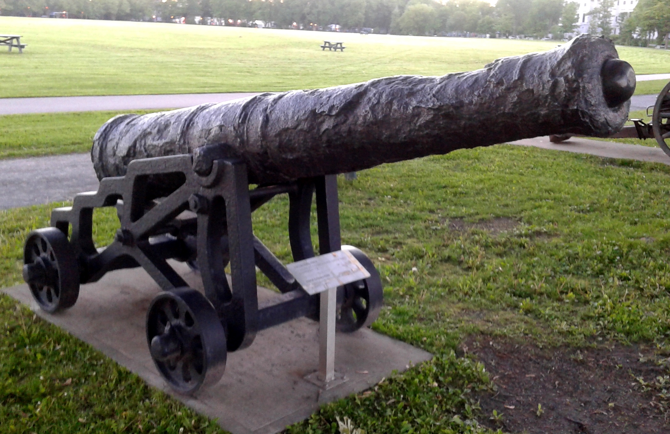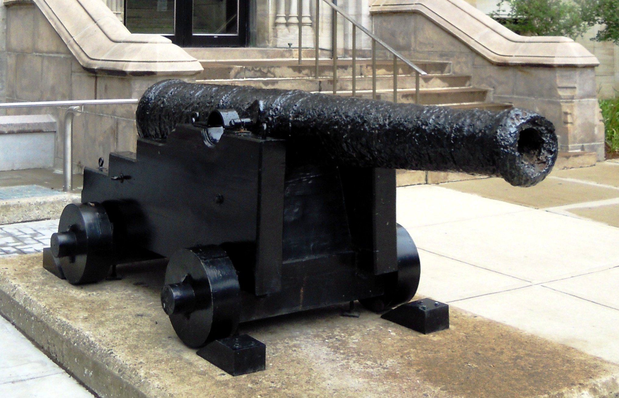 A pair of cast Iron 32-pounder smoothbore muzzleloading cannon, mounted on wood gun carriages. This cannon was recovered from Louisbourg Harbour, Nova Scotia. They stand on the grounds of the University of Toronto, King’s College Circle, Toronto, Ontario.