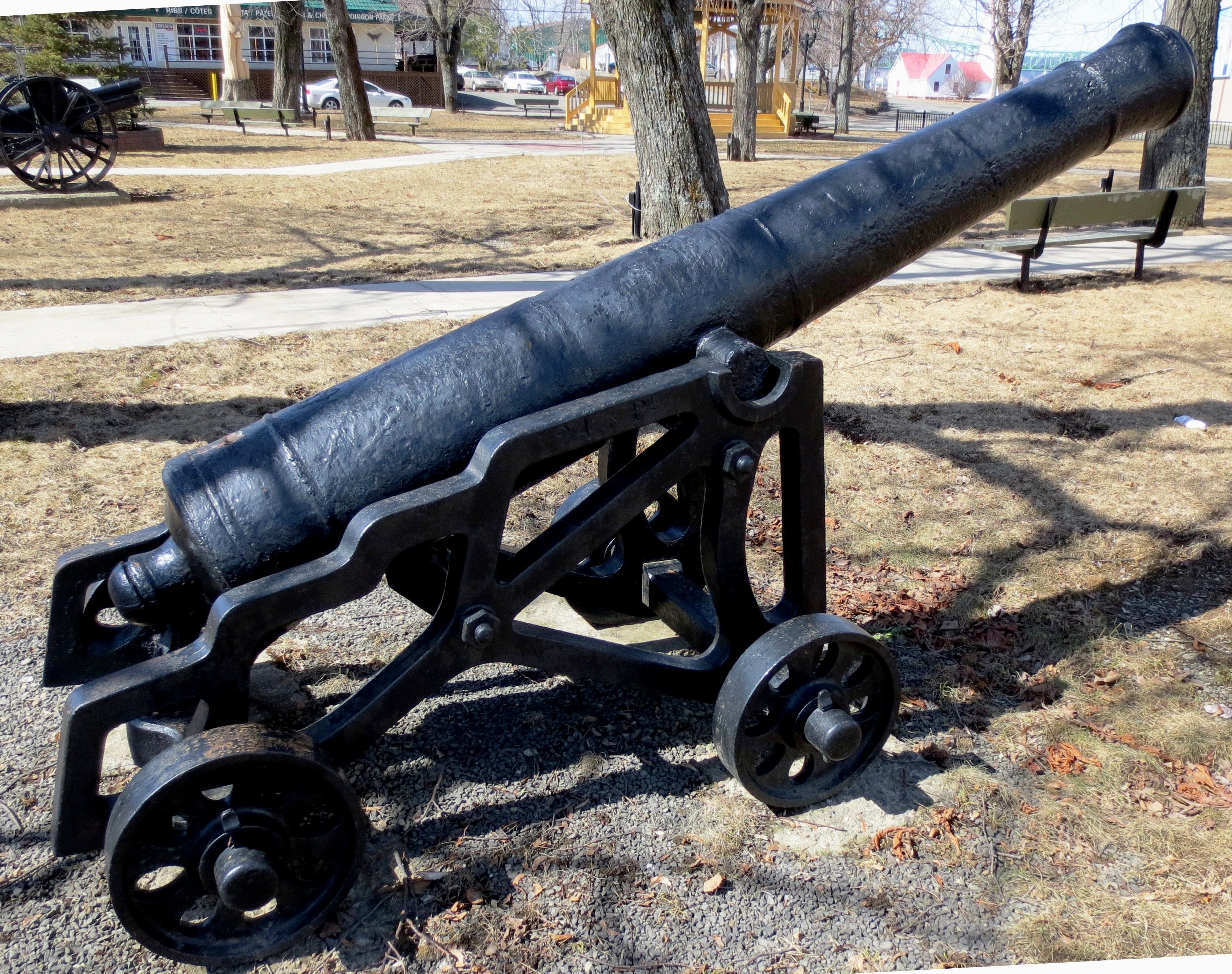 French Cast Iron 12-livre smoothbore muzzleloading cannon with a 5-inch bore (12.6-cm), with fleur-de-lys on the barrel and a large letter P on the cascable. This cannon was salvaged from the 1760 wreck of the French Frigate Machault in the Restigouche River. It is mounted on a British 24-pounder iron garrison carriage, and is placed in the No. 1 position (far right as you stand behind the guns), at Campbellton, New Brunswick.
