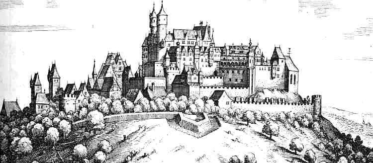 During the Hohenstaufen era, the palace was an Imperial Castle (Reichsburg), had a burgrave and Burgmannen. Its estate included Büdingen Forest, which the castle’s occupants still retained timber rights (for construction and firewood) until the 19th century.  The decline of the palace began as early as the 14th century when, in 1349, Emperor Charles IV (HRR) enfeoffed it, together with the town, to the Counts of Schwarzburg and never reclaimed it.  In 1431, the Count of Hanau and Count Palatine Louis III procured the palace and town from Count Henry of Schwarzburg.  At the end of the 16th century, the Counts of Isenburg in Birstein took over the burgrave’s office, but did not reside at the castle.  During the Thirty Years’ War, the town and palace were severely damaged and Imperial and Swedish troops razed down its main building.