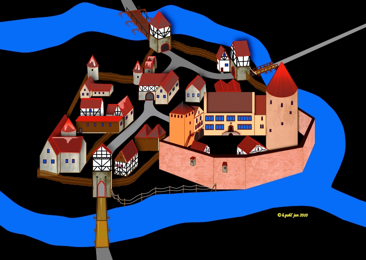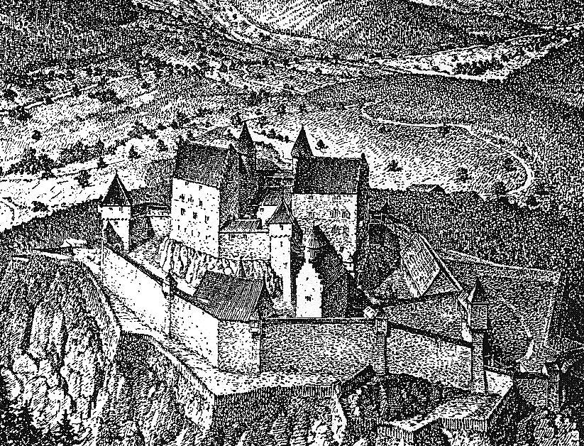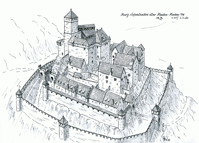 Burg Hohenbaden in the 15th century, illustration by Wolfgan Braun.