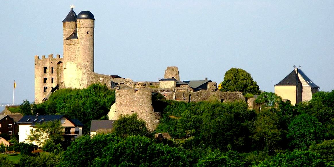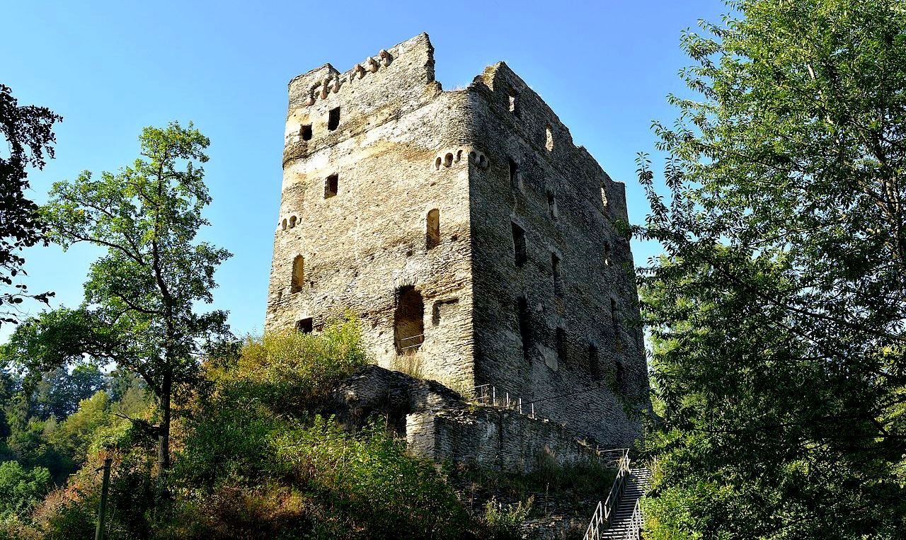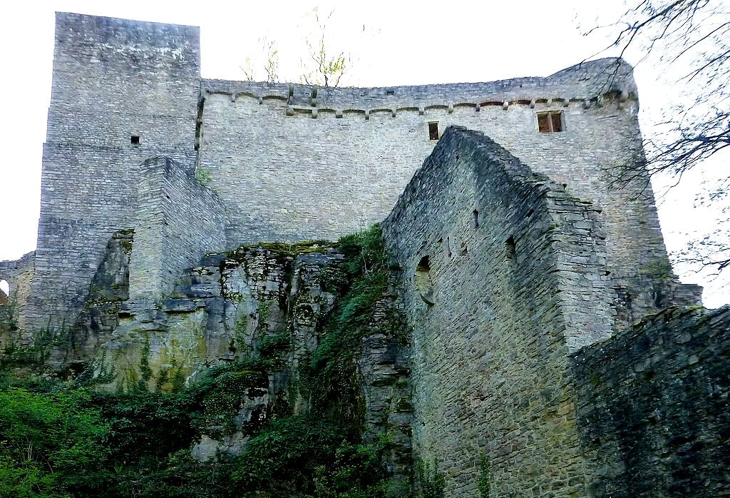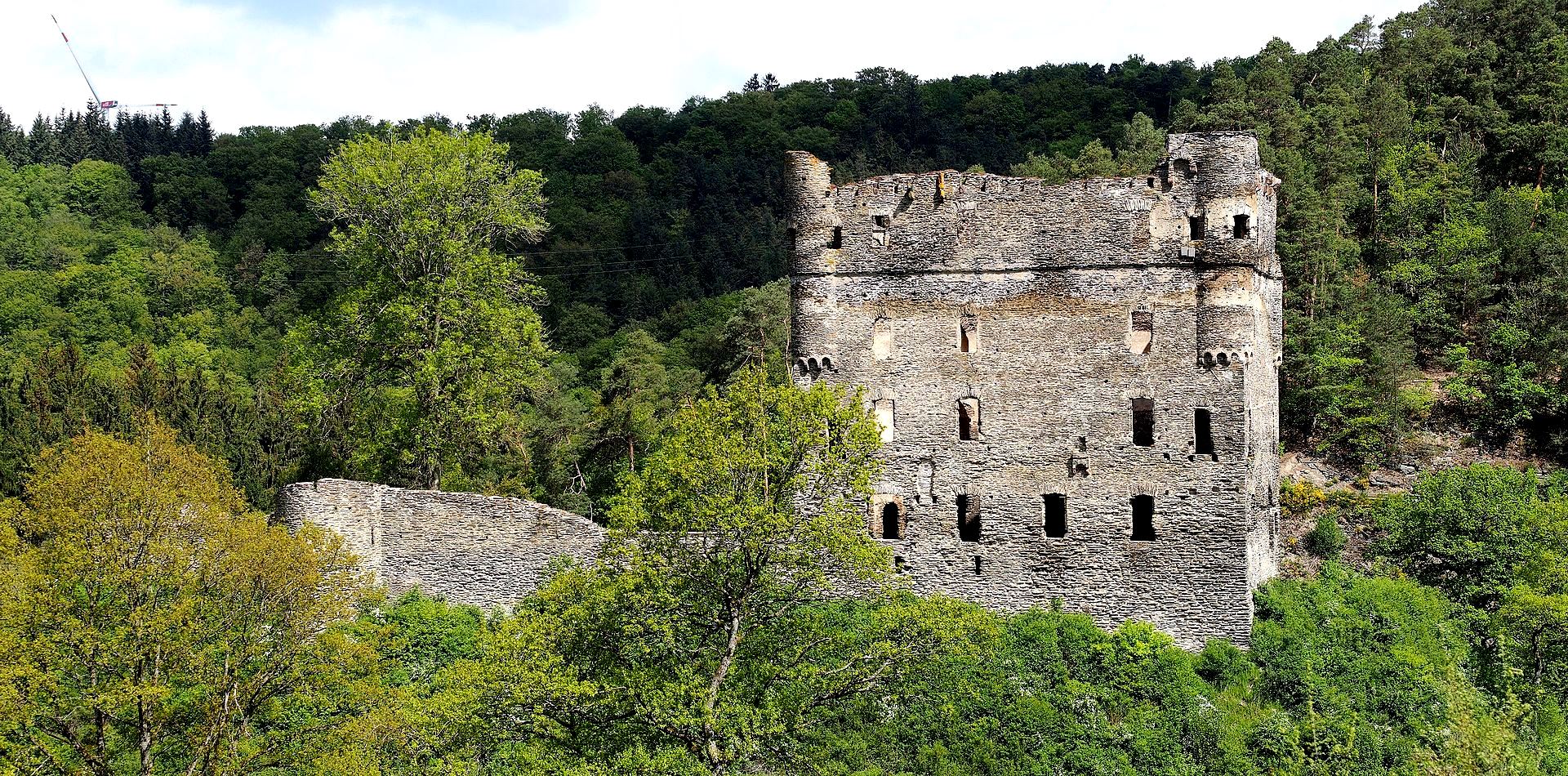The specialty of the castle is the location of the residential building that was completed first.  Contrary to the usual structure of a castle, the residential tower, which was equipped with a defensive core on the east side, stands behind the neck ditch, directly on the attack side.  Such an arrangement can be found in other castles built by Baldwin of Luxembourg.