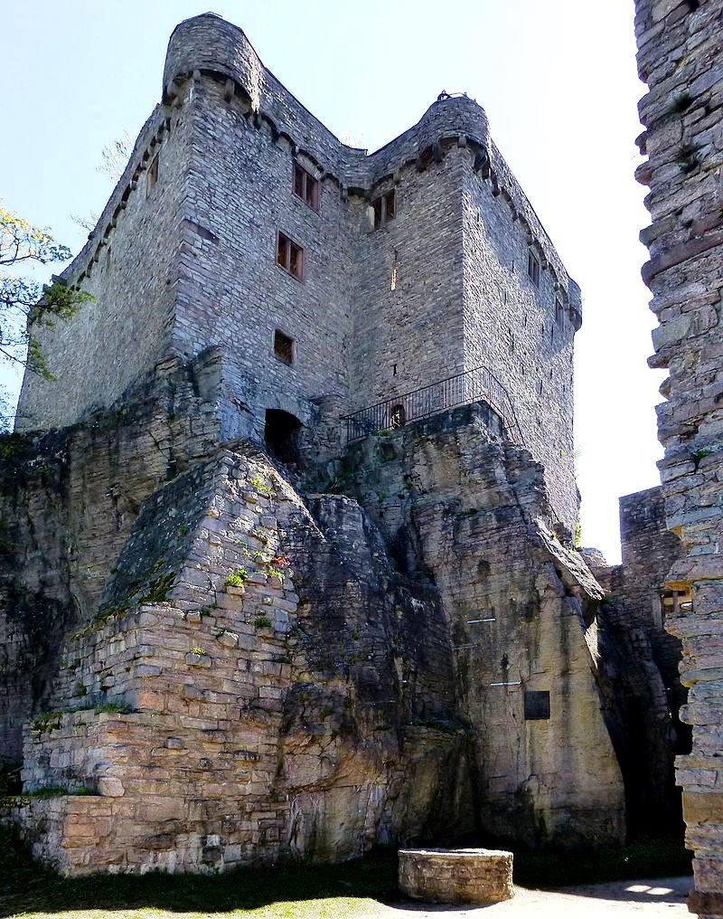 A large wind harp stands in the ruins of the great hall of the old castle. The harp, which was set up in 1999, has a total height of 4.10 meters and 120 strings, it was developed and built by the local musician and harp maker Rüdiger Oppermann, who called it the largest wind harp in Europe. The nylon strings are stimulated by the draft to produce the basic notes C and G. From 1851 to 1920 there was a small wind harp in the knight’s hall of the old castle.  (Baden-Württemberg I. Die Regierungsbezirke Stuttgart und Karlsruhe. München 1993)